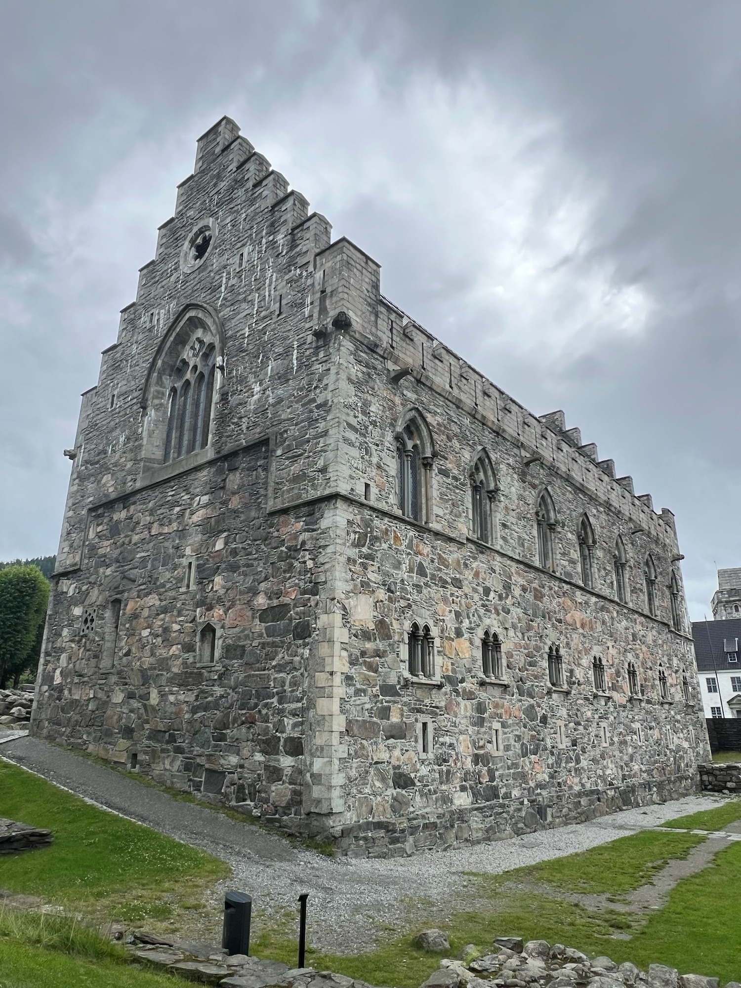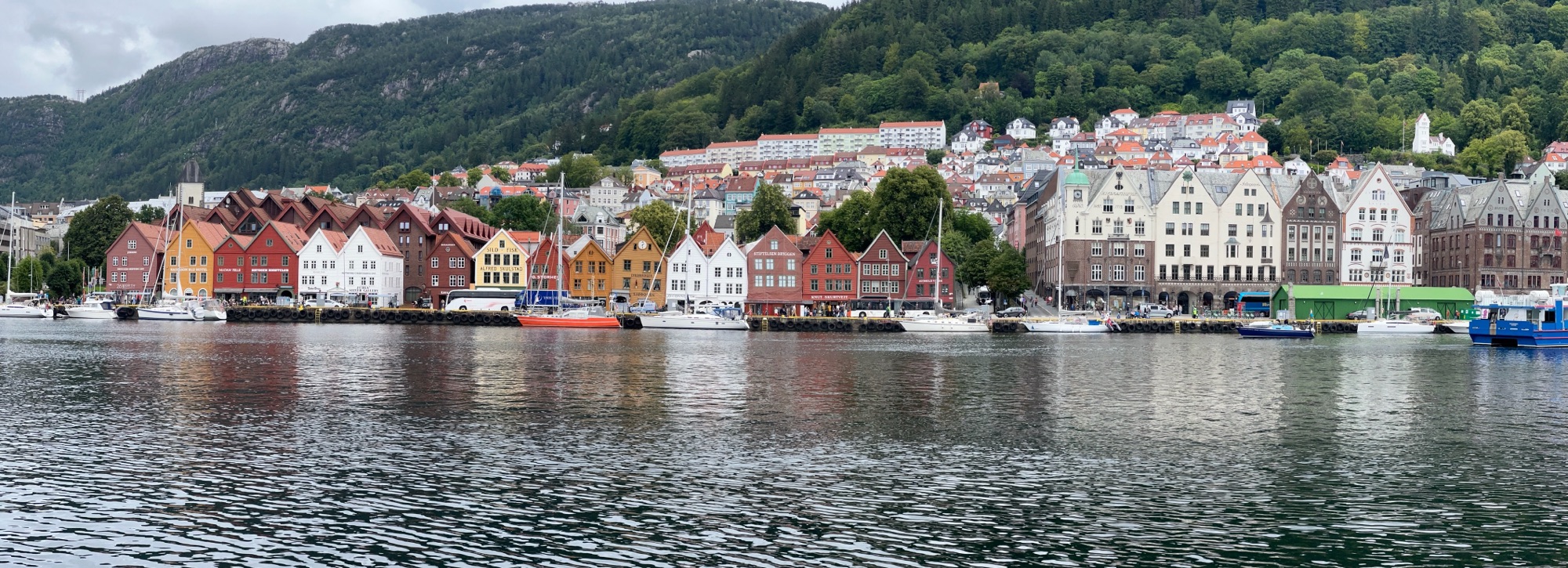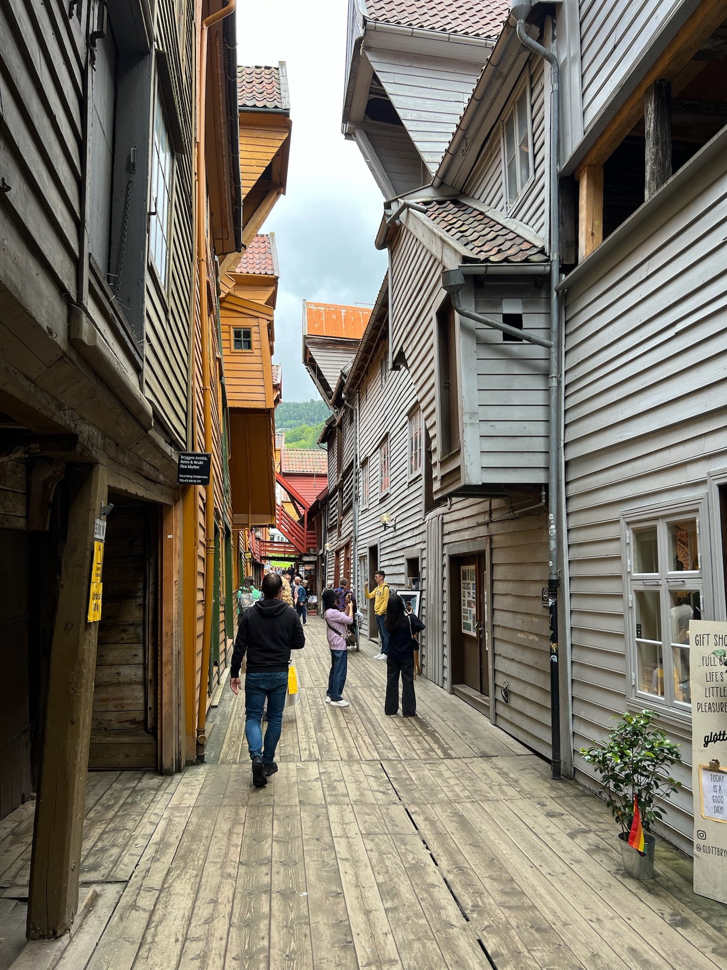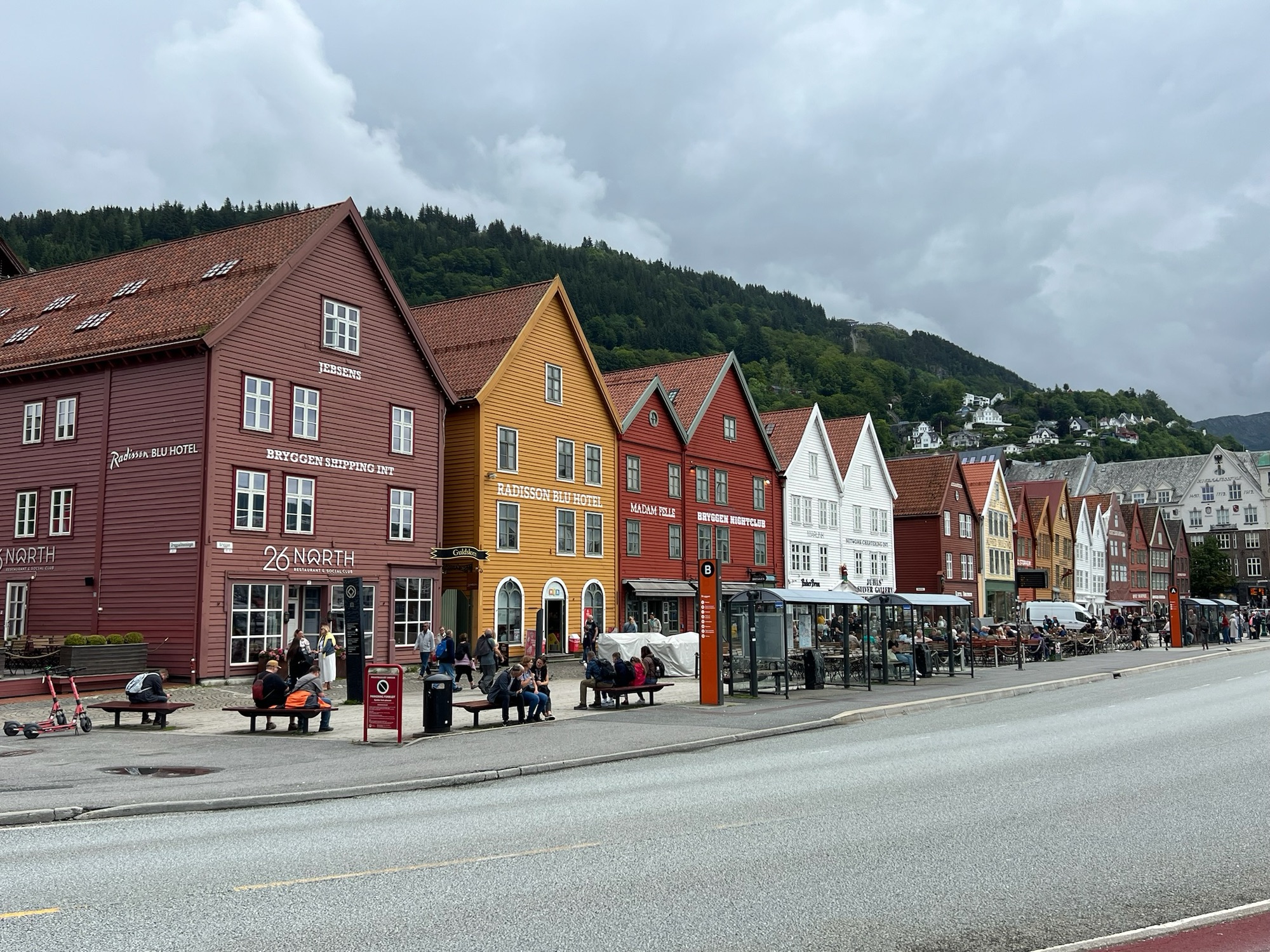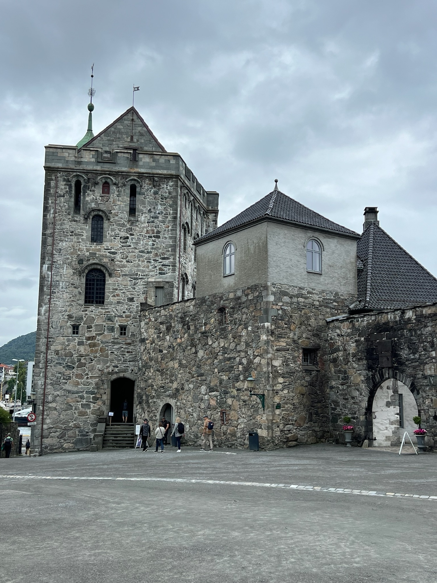 We had originally planned to be up and exploring by 9 a.m. but we ended up sleeping in and didn’t get off the ship until 11:30 a.m. Since we already went to the top of the Floibanen the night before and the clouds cooperated and we had great views we decided we didn’t need to make another trip. Instead we decided to explore in-depth some of the sites we saw on our segway tour. First was the Bergenhus Fortress. The oldest part dates back to 1270 when it was part of the Norwegian Royal Castle. Close by was the historic Bryggen Wharf constructed of wooden houses and is a UNESCO World Heritage site. This area was key to the Hanseatic Bryggen merchants. The trading merchants were vital to developing the city to what it is today.