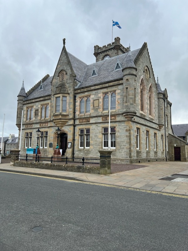 Prior to our cruise we had arranged a tour of the area with Grant who runs Shetland Minibus Tours. Our first stop was Lerwick Town Hall which was built in 1883. Once there we got a brief history of the annual Fire Festival held in January. Up Helly Aa is a 24-hour festival held on the last Tuesday of the month to celebrate their history and Norse heritage. We even got to try on a Viking helmet, shield and wield an ax.